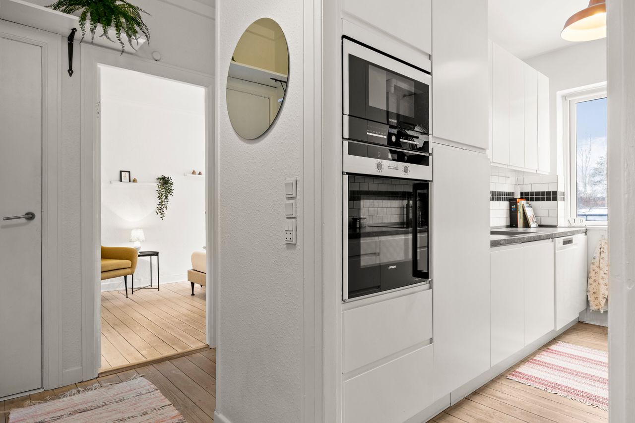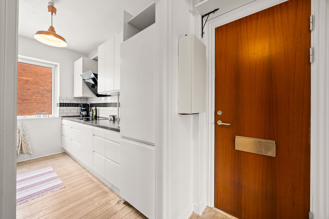 Boligen rummer desuden et stort soveværelse med rummeligt indbygget skab, et pænt badeværelse med bruseniche samt et stilrent køkken med god skabsplads og vindue mod gården. De flotte plankegulve fuldender det indbydende udtryk og skaber en rød tråd gennem hele lejligheden.