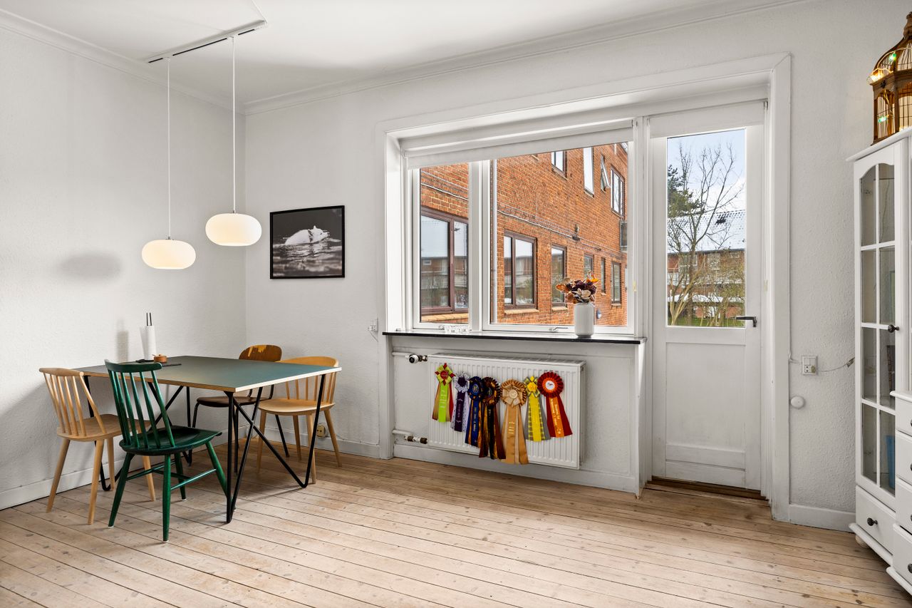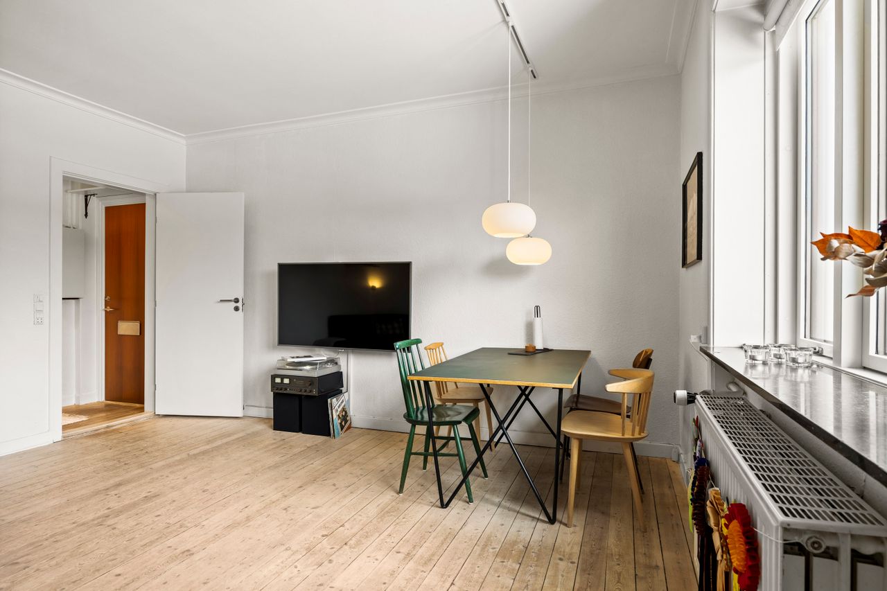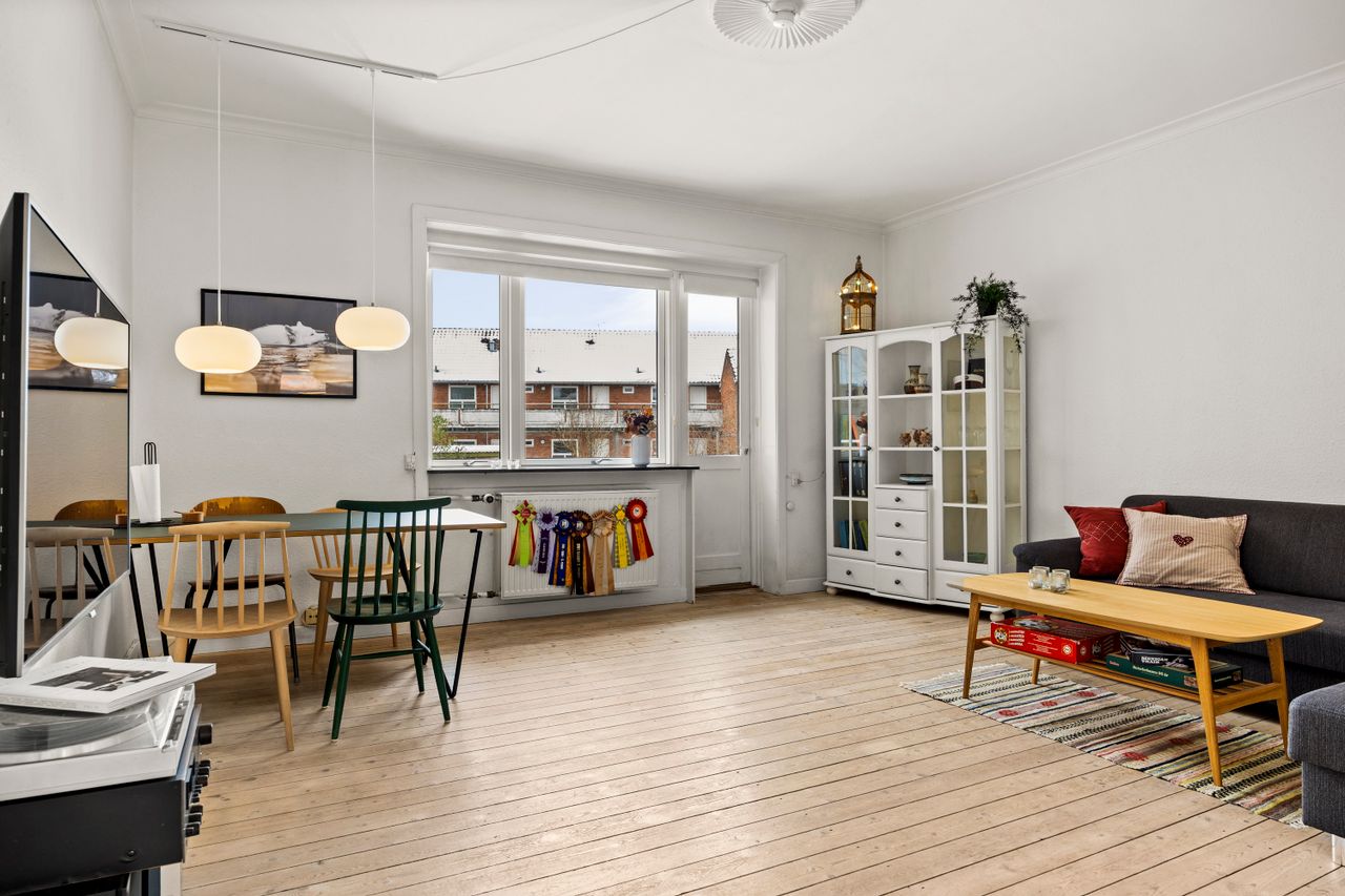 Boligen rummer desuden et stort soveværelse med rummeligt indbygget skab, et pænt badeværelse med bruseniche samt et stilrent køkken med god skabsplads og vindue mod gården. De flotte plankegulve fuldender det indbydende udtryk og skaber en rød tråd gennem hele lejligheden.