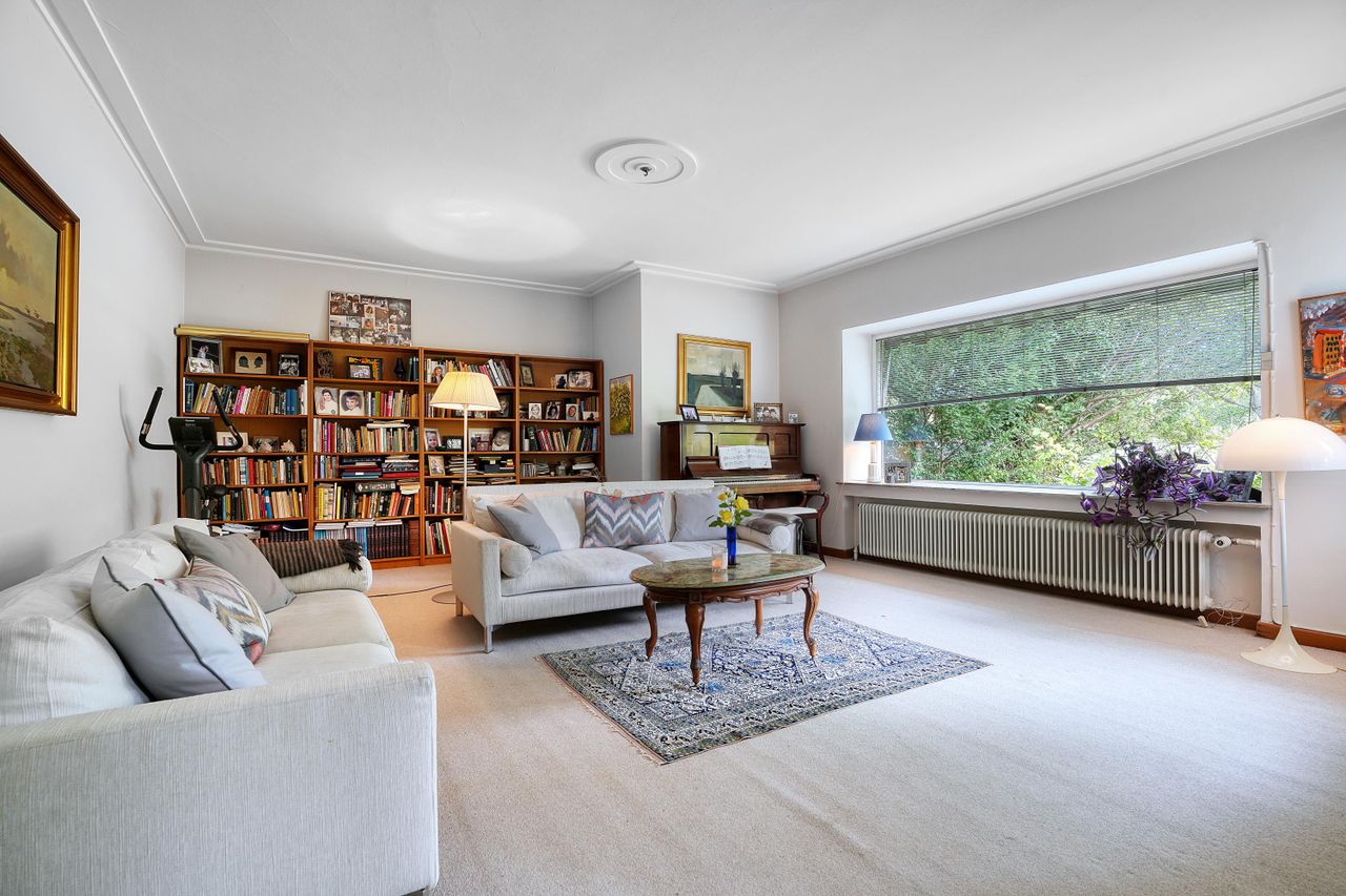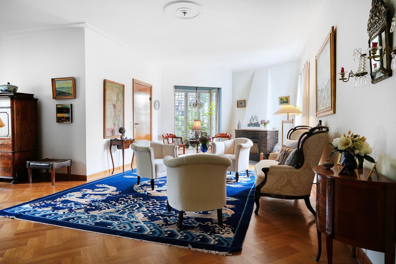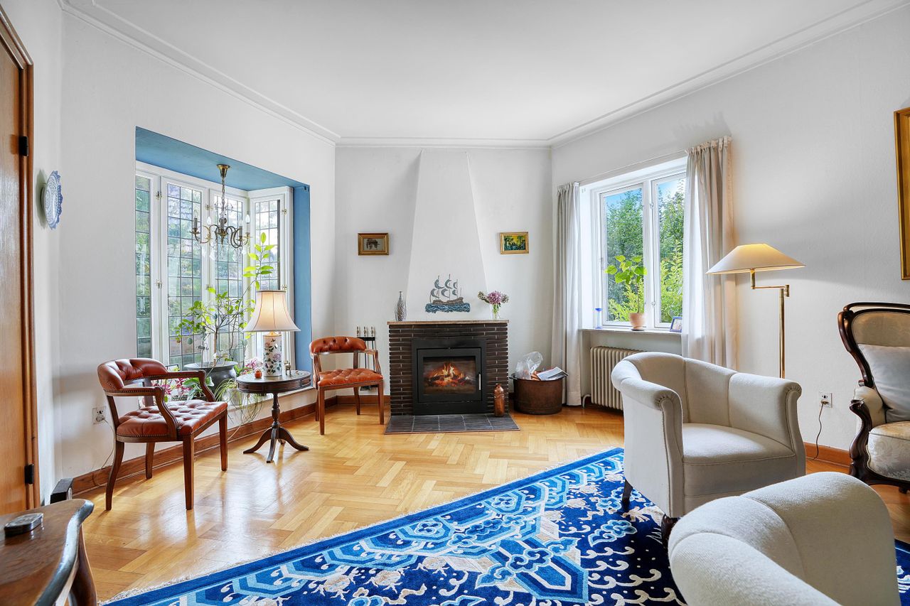 Villaen har et imponerende stueplan med tre store stuer, der tilsammen udgør omkring 105 kvadratmeter. Disse stuer er udstyret med smukke sildeben parketgulve af egetræ, og alle indfatninger samt døre er også af egetræ. En af stuerne har en karnap mod syd, som tilføjer en hyggelig atmosfære med en pejseindsats.