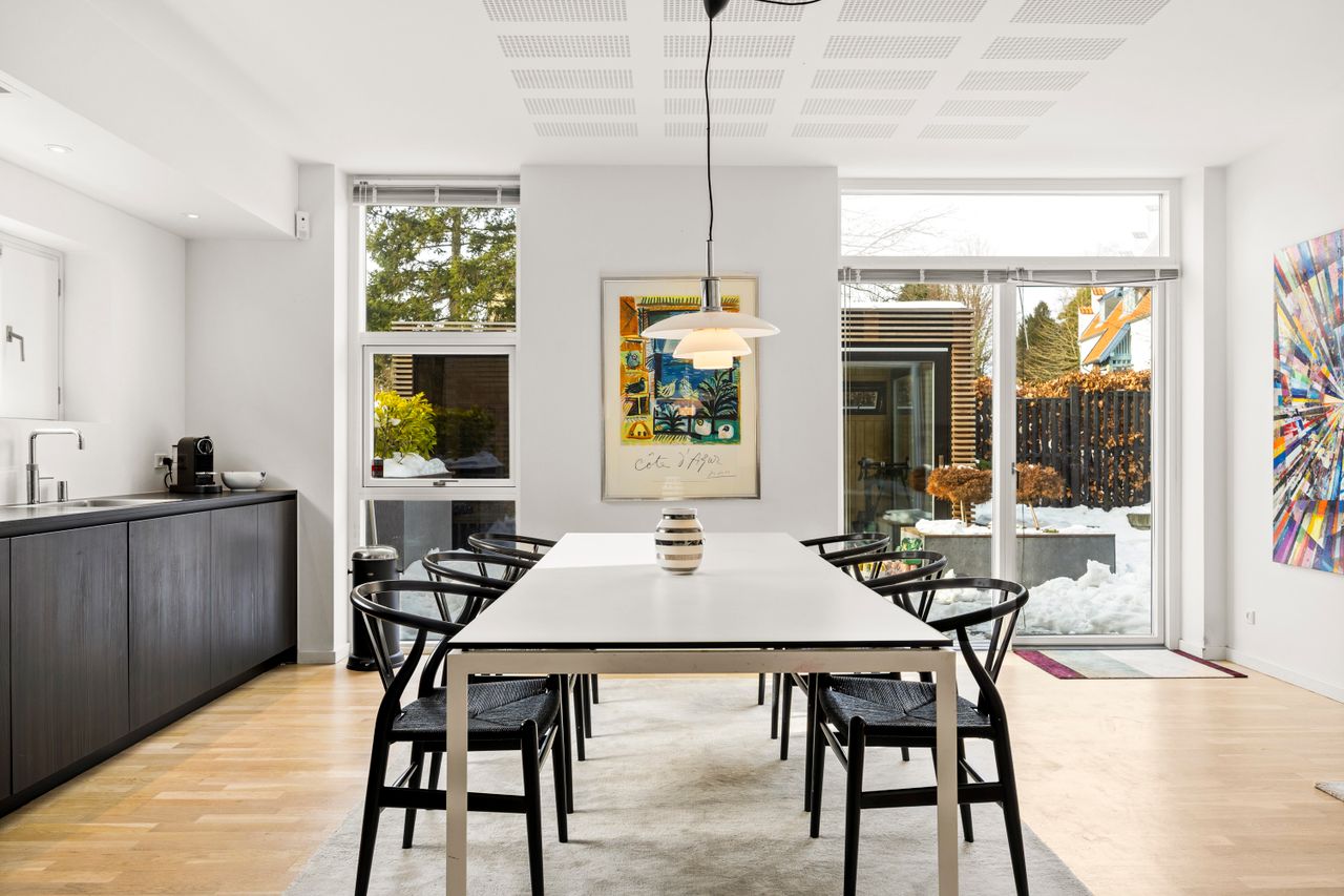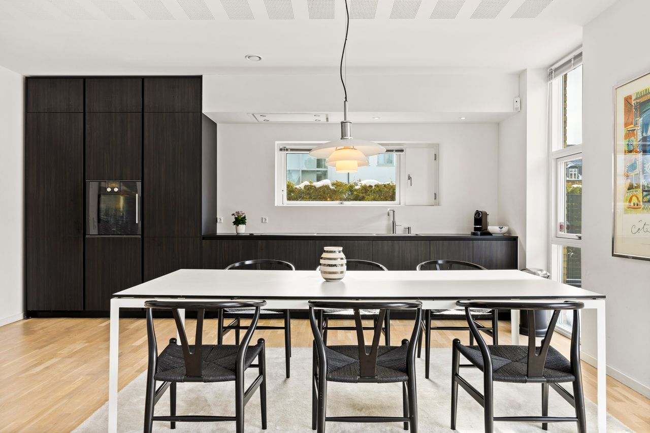Boligens naturlige samlingspunkt er det åbne køkken-alrum og stue i ét, hvor der er god plads til både spiseafdeling og sofaarrangement. Køkkenet er stilrent og moderne med mørke, grebsfrie elementer, integrerede hårde hvidevarer og loftintegreret emfang – et elegant og funktionelt rum, der indbyder til både madlavning og samvær.