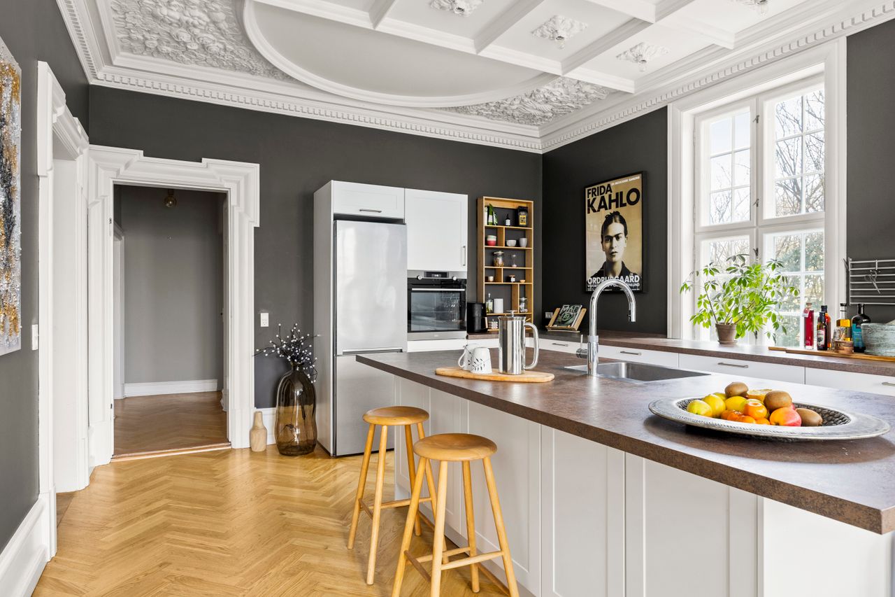 Boligens naturlige omdrejningspunkt er det store køkken-alrum, der er etableret i den oprindelige spisestue. Her mødes man af en unik stukatur i absolut særklasse – ganske enkelt noget, der kun ses meget få steder – og som vidner om ejendommens fornemme ophav. Et rum, der både imponerer visuelt og fungerer perfekt til hverdagsliv såvel som større selskaber.