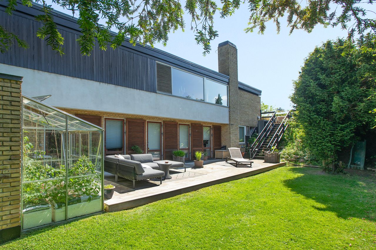 Villaen, opført i 1963, er smukt integreret i den skrånende grund, hvilket arkitekten har udnyttet optimalt. Hjemmet imponerer med en gennemtænkt planløsning, der skaber en harmonisk sammenhæng mellem rummenes funktionalitet og æstetik – ideel både til dagligdagen og til større sammenkomster.